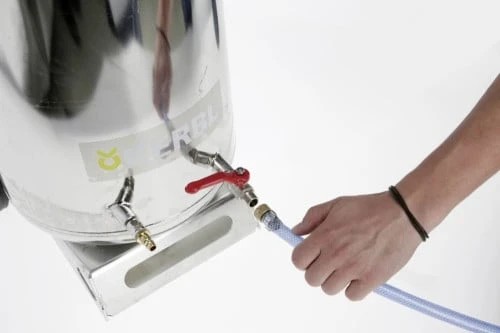 2) Wlej preparat przez lejek, zamknij zbiornik. Podłącz wąż powietrza od sprężarki i ustaw ciśnienie robocze (w razie potrzeby użyj regulatora 296017).