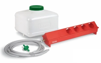 W zestawie znajduje się poidło korytkowe z 8 otworami, zbiornik 8 litrów, 10-metrowy wąż oraz filtr wody. System można podłączyć zarówno do zewnętrznego zbiornika, jak i do sieci wodociągowej przy użyciu przyłącza o średnicy ∅10 mm.