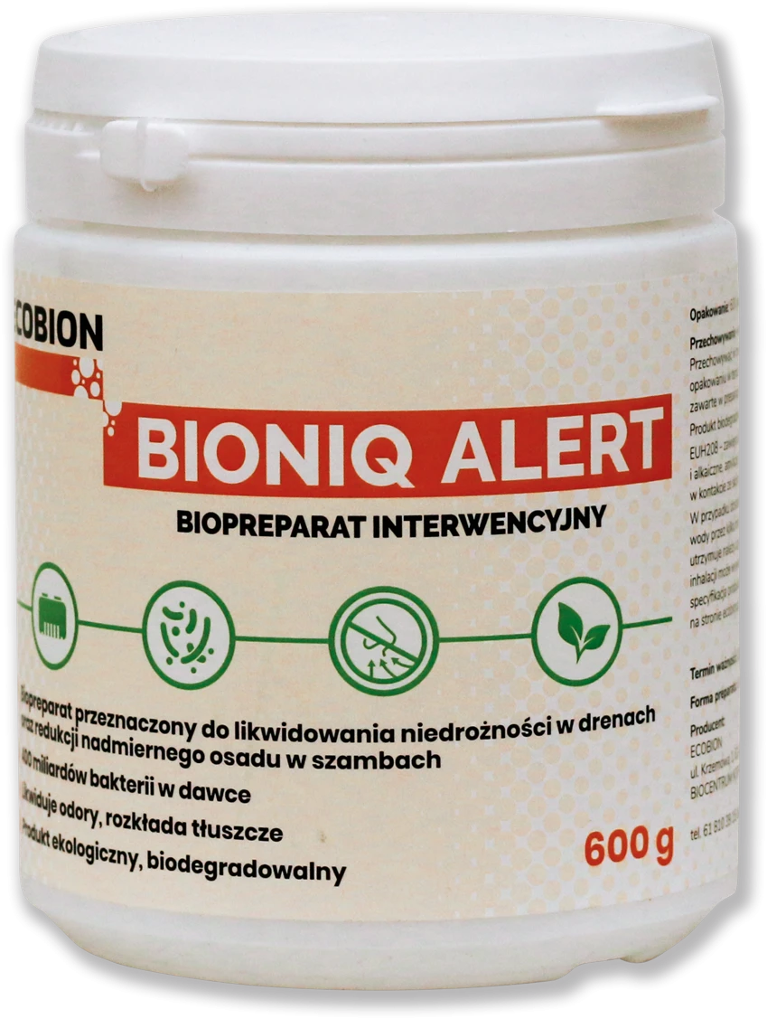 BioniQ Alert ‒ profesjonalny produkt biotechnologiczny przeznaczony do likwidacji niedrożności w instalacjach przydomowych oczyszczalni ścieków (szczególnie zatorów w systemie drenów rozsączających) oraz upłynniania i redukcji osadów dennych w szambach. Skład biopreparatu oparty jest na wysokiej koncentracji przemysłowych, niepatogennych szczepów bakteryjnych z rodzaju Bacillus o łącznym ładunku ≥ 400 miliardów komórek/100 g dawki.
