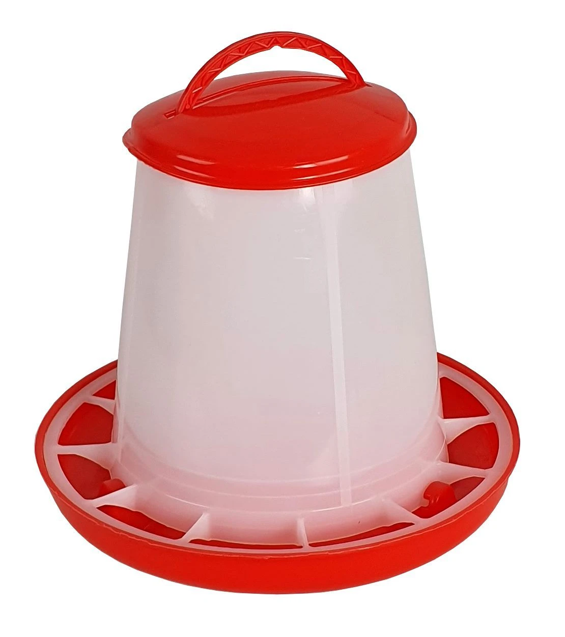 Karmnik zasypowy 1,5 kg biało-czerwony dla drobiu i przepiórek: pokrywa zdejmowana, żeberka przeciw rozsypywaniu, uchwyt do przenoszenia/zawieszania. SKU 04-0264, EAN 5902385811880.
