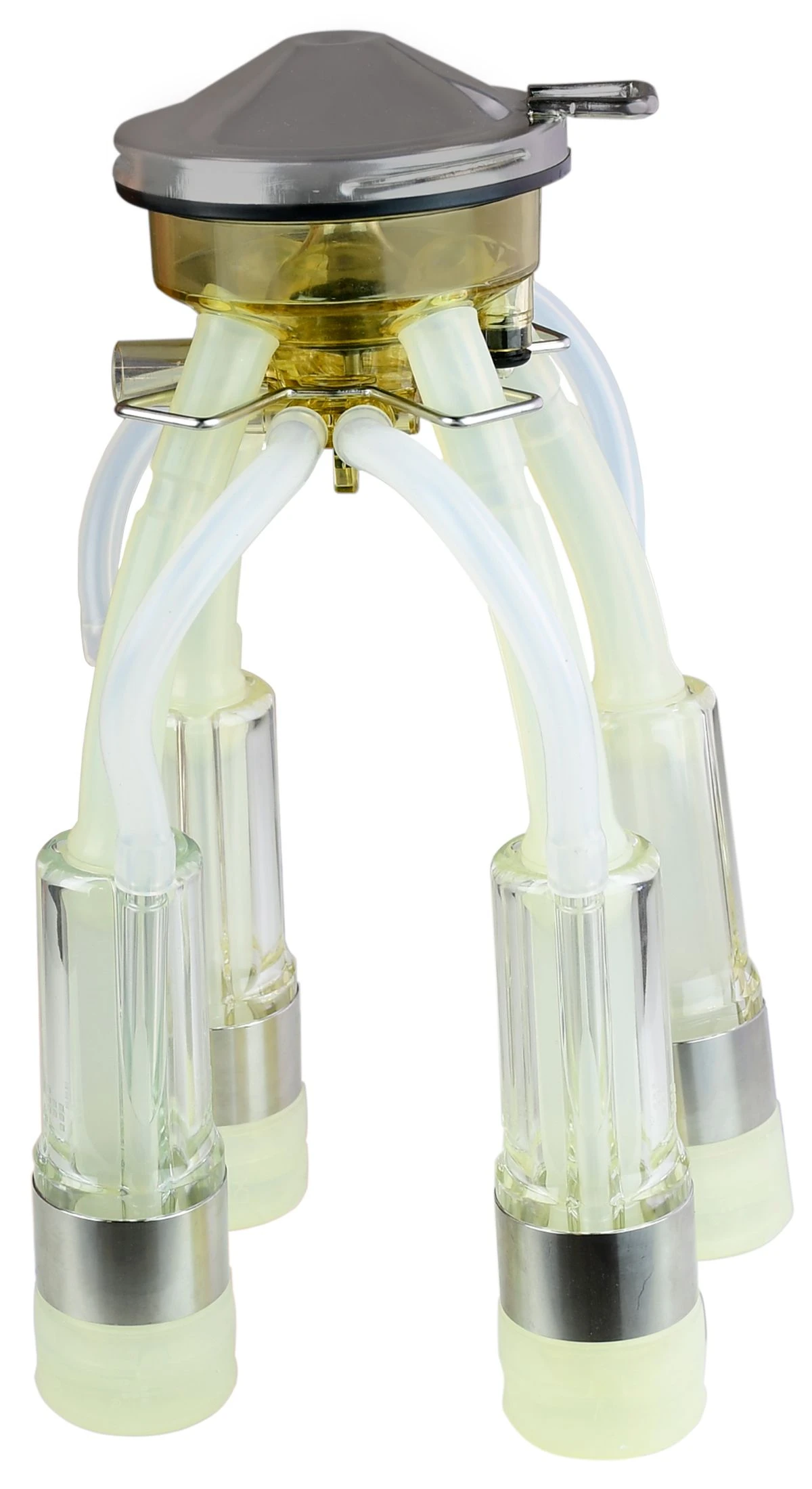 Kompletny aparat udojowy: kolektor 360 ml z wytrzymałego tworzywa, kubki z tworzywa i stali, trójkątne silikonowe gumy IP13U. Precyzyjna pulsacja, lepsze przyleganie i wyższy komfort krowy.
