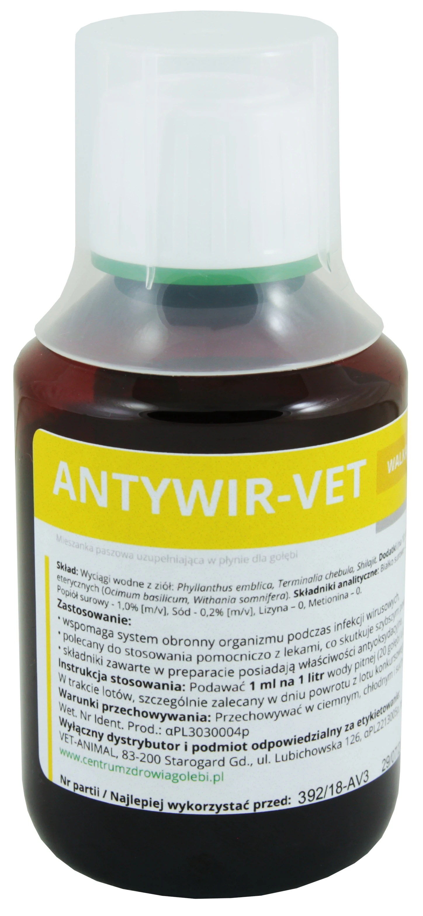 Podawać 1 ml na 1 litr wody pitnej (20 dorosłych gołębi) przez 5 dni. W trakcie lotów zalecany w dniu powrotu z lotu konkursowego. W ciężkich infekcjach wirusowych wskazane stosowanie z IMMUNO-VET lub HYDRODIAR-VET.