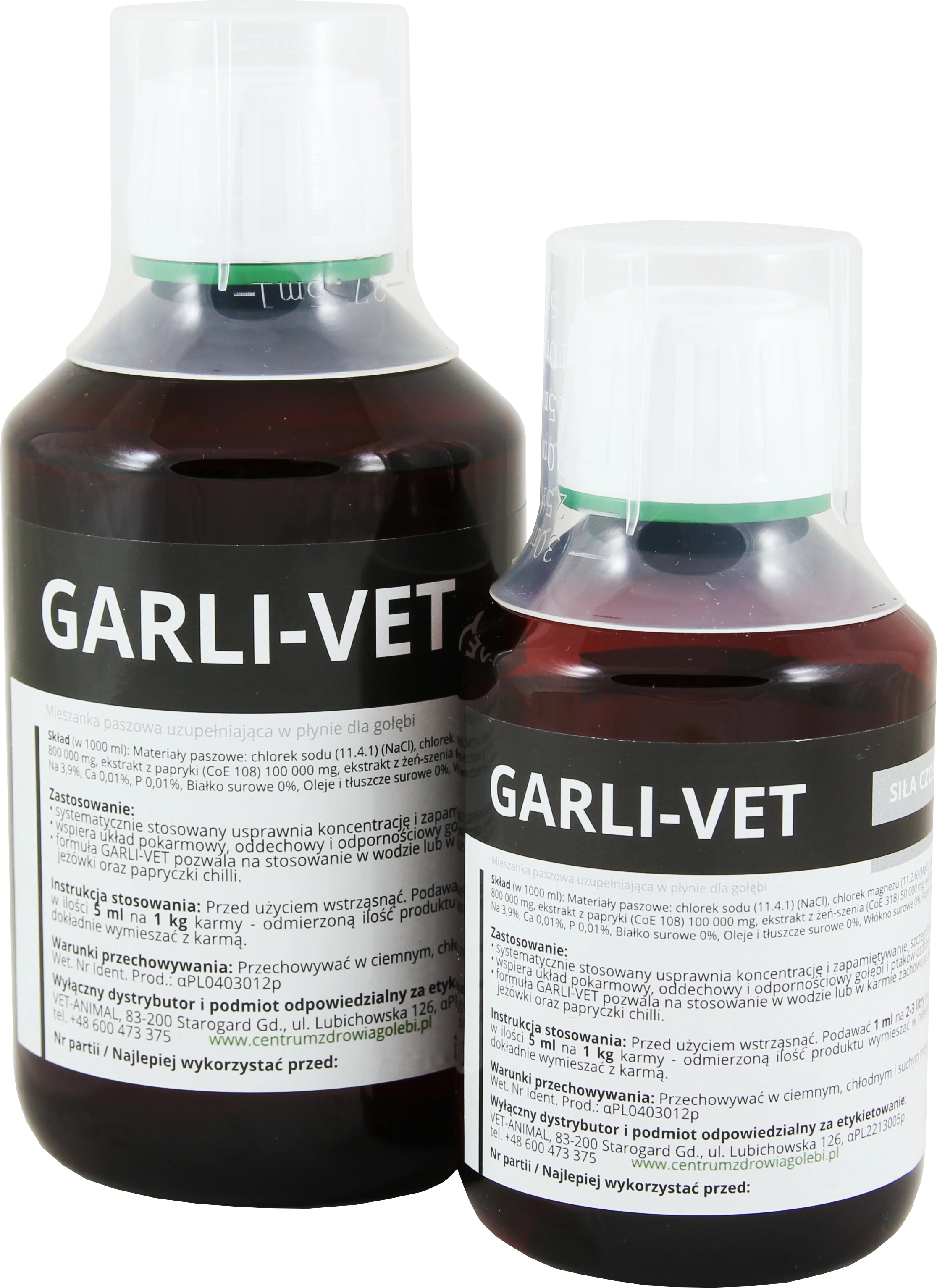 - Formuła GARLI-VET (postać aktywnego toniku) pozwala na stosowanie w wodzie lub w karmie zachowując aktywne właściwości czosnku, żeń-szenia, jeżówki oraz papryczki chilli (kapsaicyna).