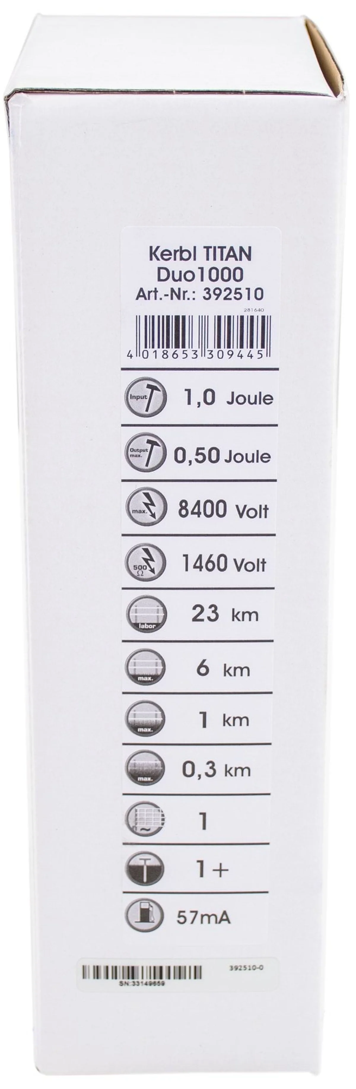 Elektryzator Kerbl TITAN DUO 1000 – 1.0 J, zasilanie 230V/12V. Do koni, bydła i małych zwierząt. Stabilny impuls i prosta obsługa. SKU 392510, EAN 4018653309445