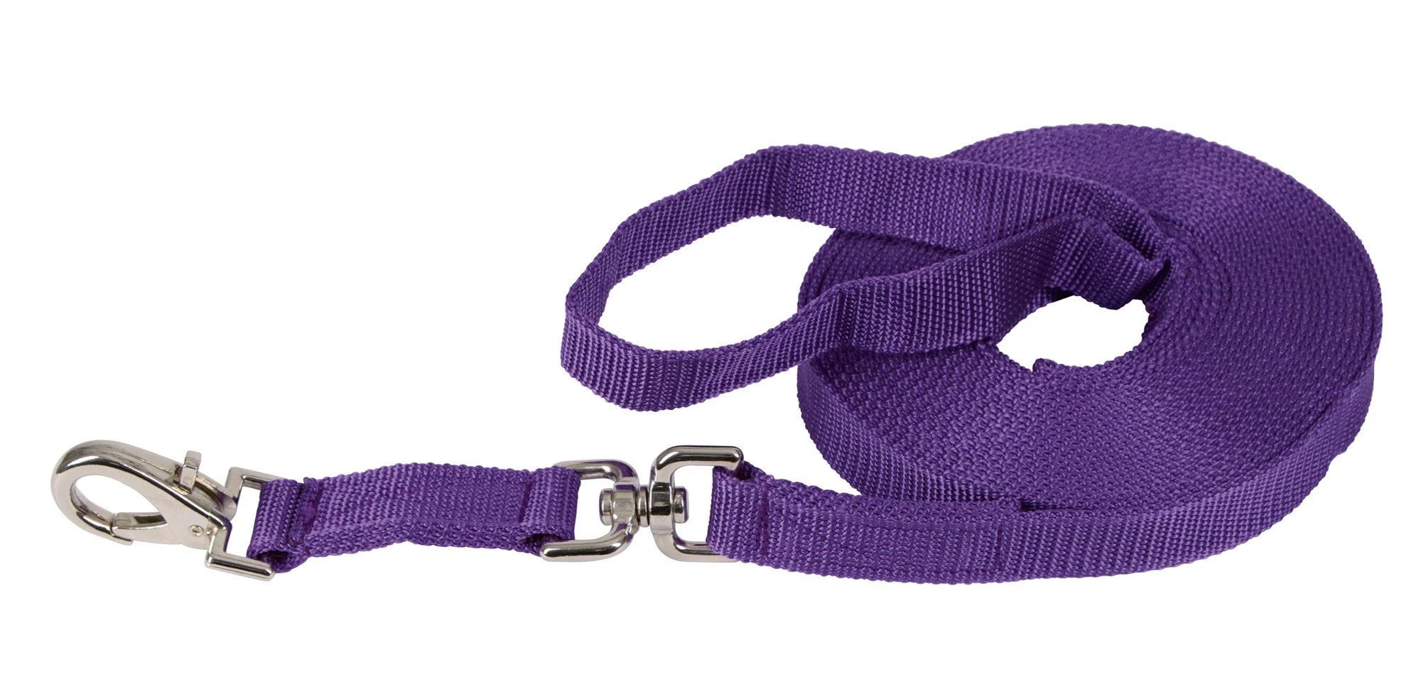 Wytrzymała lonża treningowa w kolorze granatowym, wykonana z 100% polipropylenu. Wyposażona w wysokiej jakości krętlik oraz solidny karabińczyk, zapewnia płynną pracę bez skręcania taśmy i pewne podpięcie do kawecanu lub ogłowia.