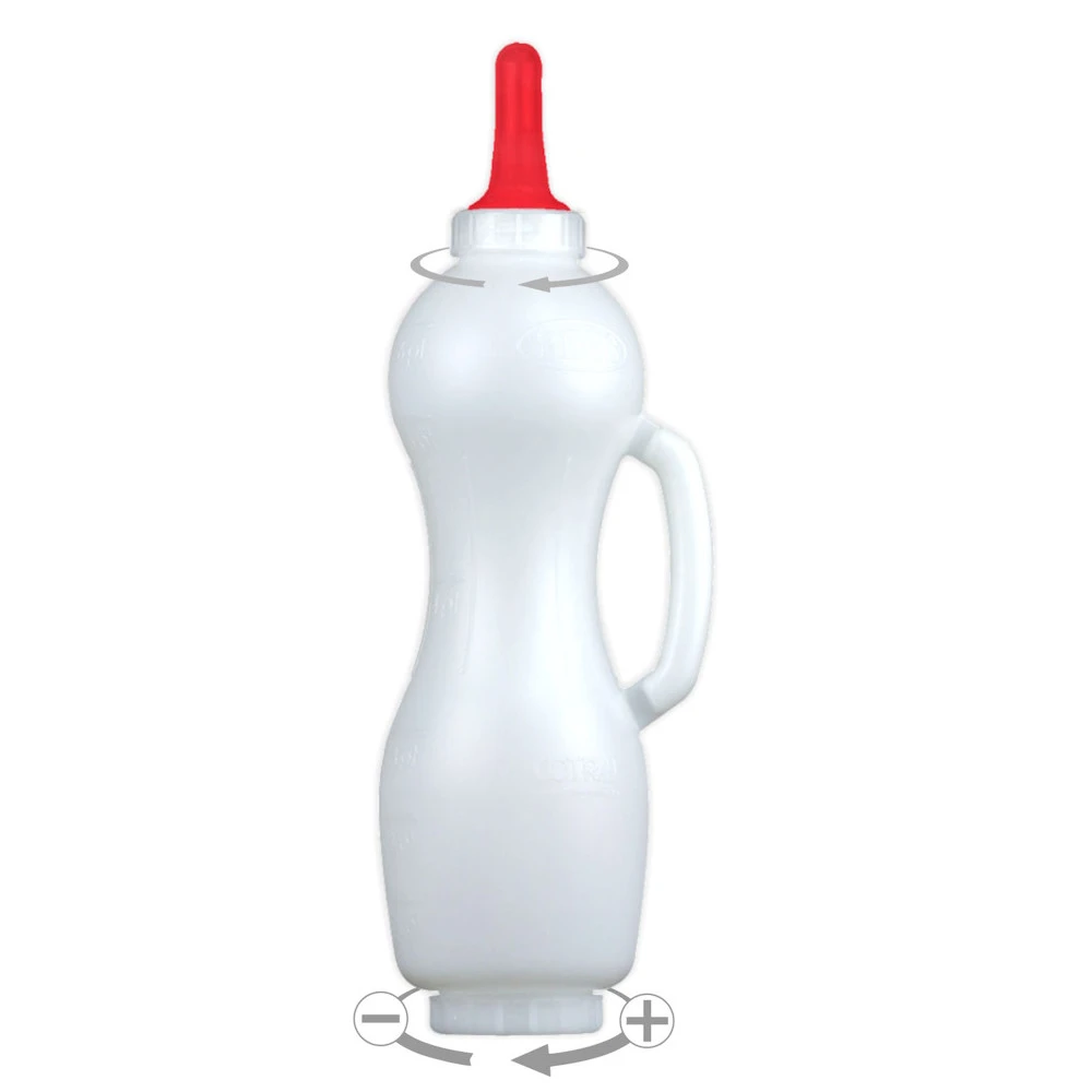 Nalej mleko zgodnie z podziałką. Trzymając butelkę za uchwyt, podaj ją cielęciu. Mleko wypływa tylko podczas aktywnego ssania – to zapewnia maksymalne bezpieczeństwo i wspiera rozwój układu trawiennego cielęcia.