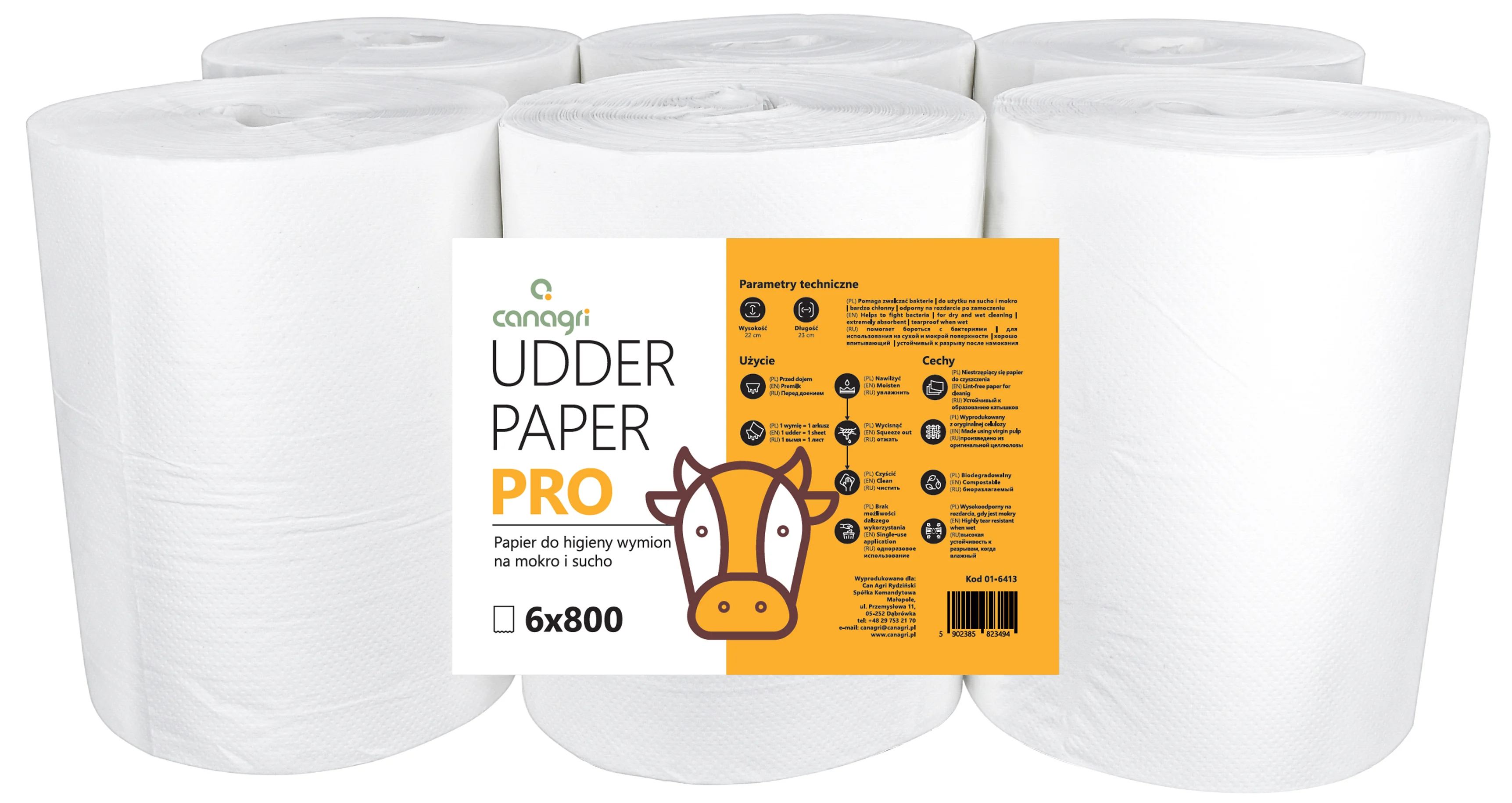 Papier do higieny wymion Udder Paper Pro, na mokro i sucho, 23 x 22 cm, 6 x 800 list., Can Agri