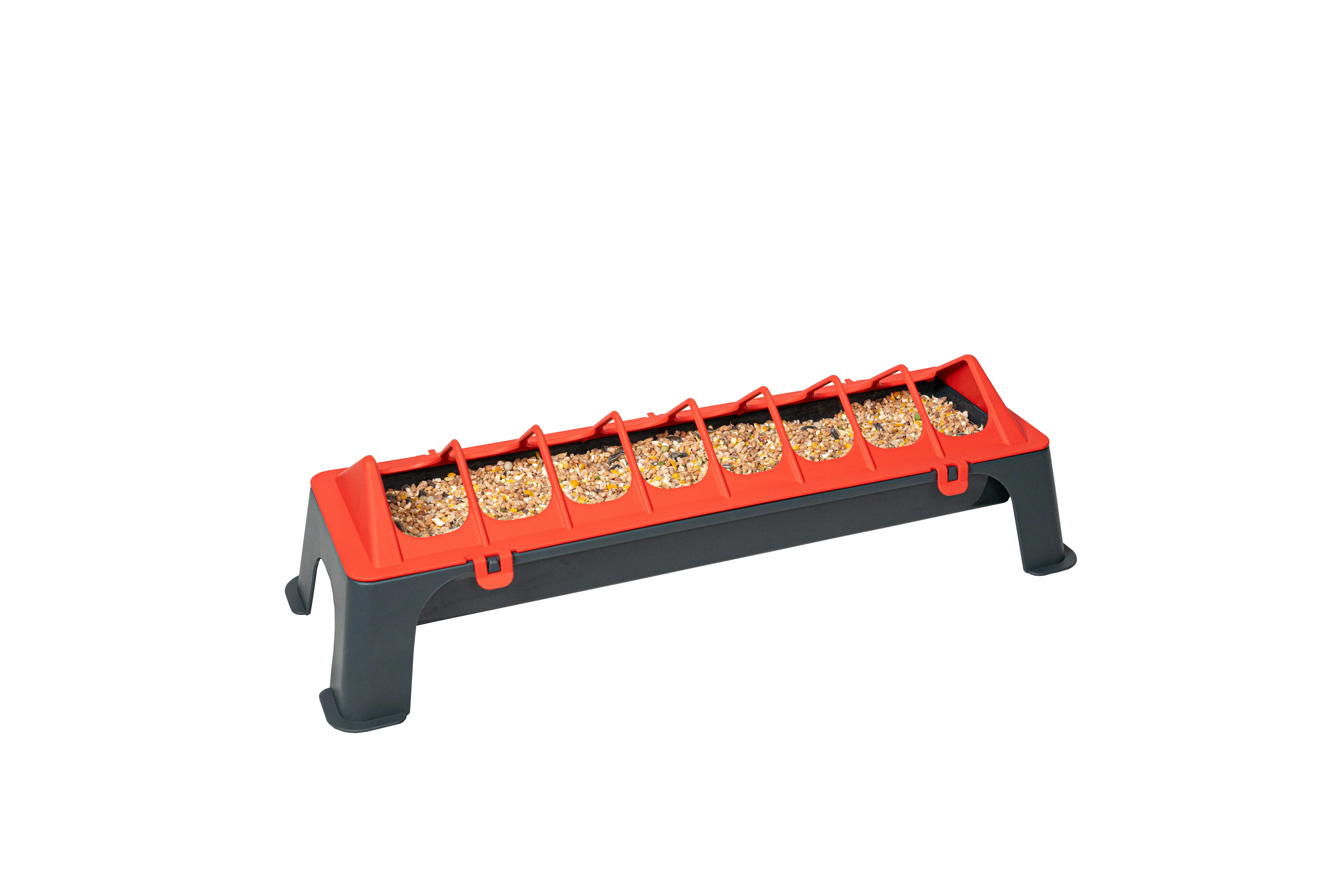 Korytko posiada 14 przegródek, które skutecznie zapobiegają rozsypywaniu paszy oraz uniemożliwiają ptakom wchodzenie do środka. Dzięki temu pasza pozostaje czysta i dostępna dla wszystkich ptaków.