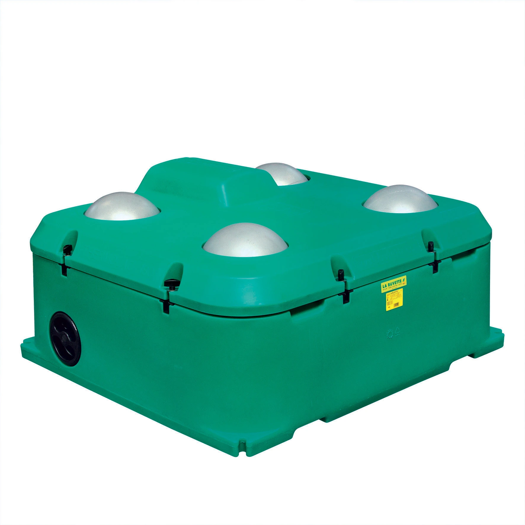 Poidło mrozoodporne THERMOLAC 180 GV La Buvette: nieelektryczne, bezszronowe, 4 izolowane kule, pojemność 180 l. Zawór pływakowy 72 l/min (3 bar), do 60 szt. bydła, do −30°C. Podwójna ścianka PEHD + pianka PU, Ø stojaka 300 mm, korek Ø100 mm, wąż w oplocie w zestawie.