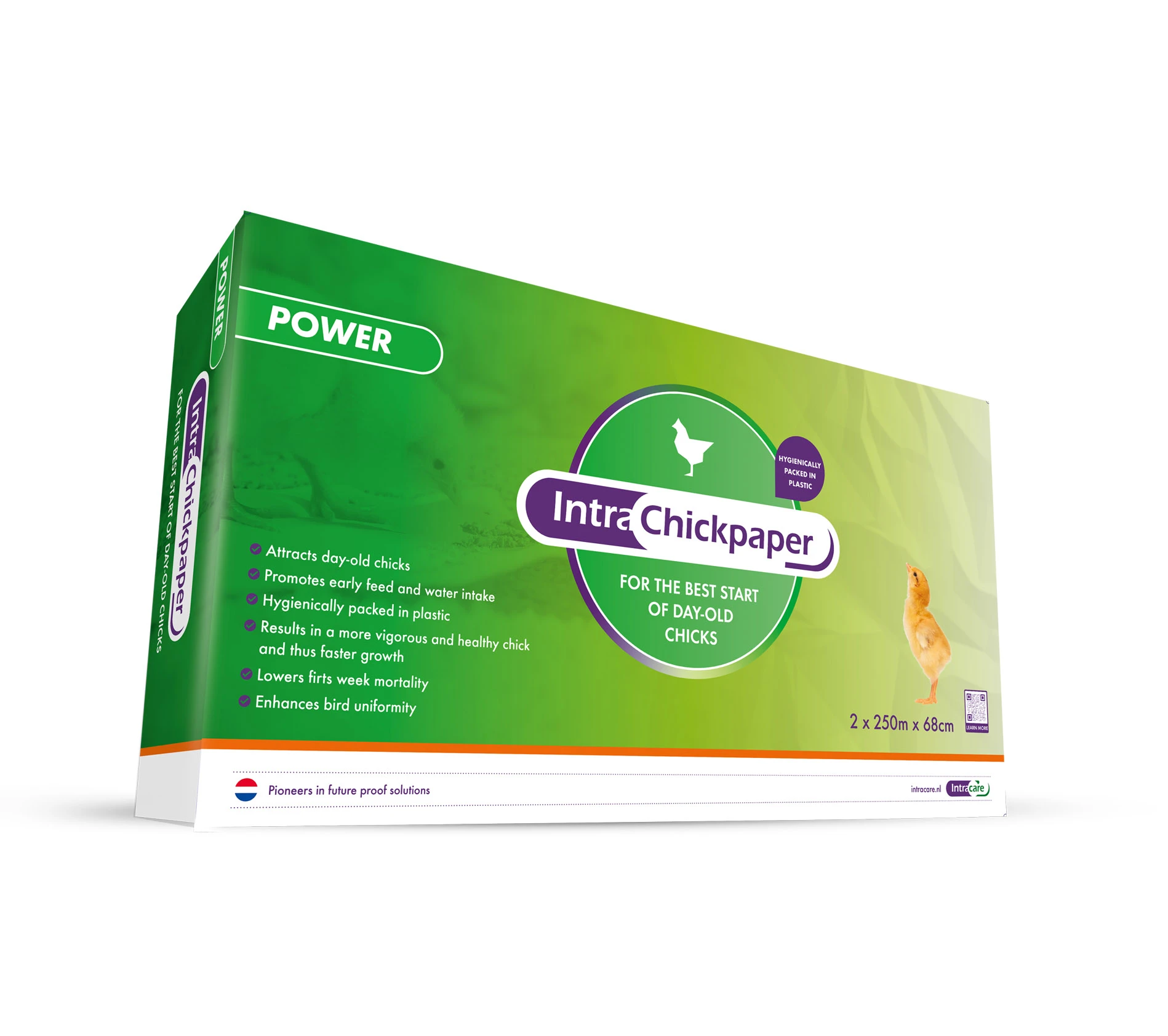 Papier dla kurcząt Intra Powerpaper to innowacyjne rozwiązanie wspierające zdrowy start piskląt w pierwszych dniach życia. Dzięki szeleszczącej strukturze oraz właściwościom absorpcyjnym przyciąga uwagę kurcząt, zachęcając je do szybkiego rozpoczęcia pobierania paszy i wody, co wspomaga prawidłowy rozwój układu pokarmowego i odpornościowego.
