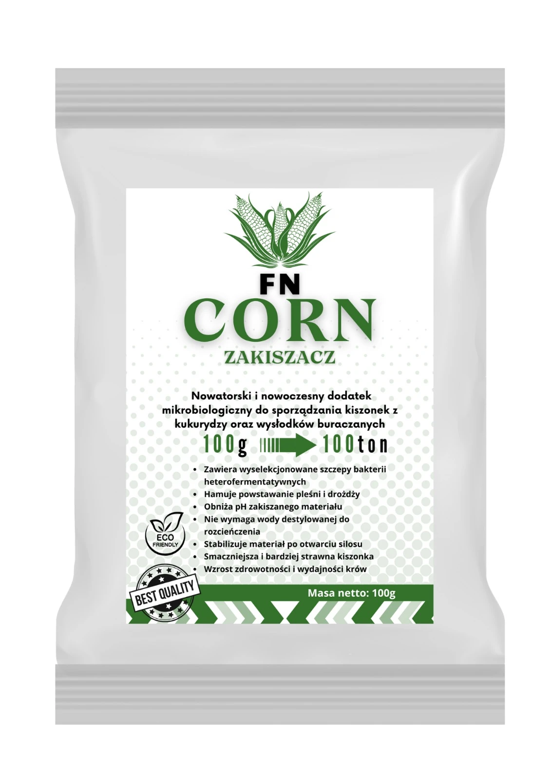 FN Corn 100 g – zakiszacz biologiczny Center Plast do kukurydzy i roślin pastewnych bogatych w cukry. Zawiera aktywne bakterie kwasu mlekowego, poprawia fermentację, smakowitość i stabilność kiszonki.