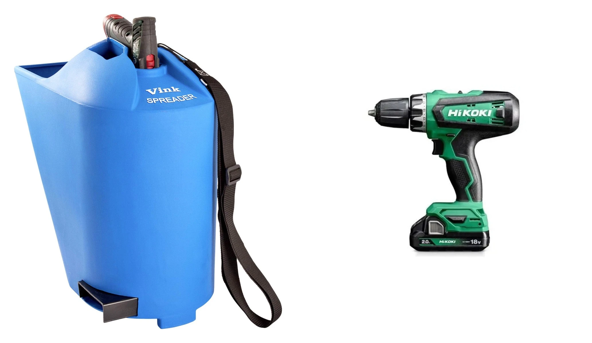 - Wyposażenie zestawu: rozsiewacz VINK 12 L, wkrętarka HiKOKI DS18DFWCZ, 2 baterie, ładowarka, walizka
