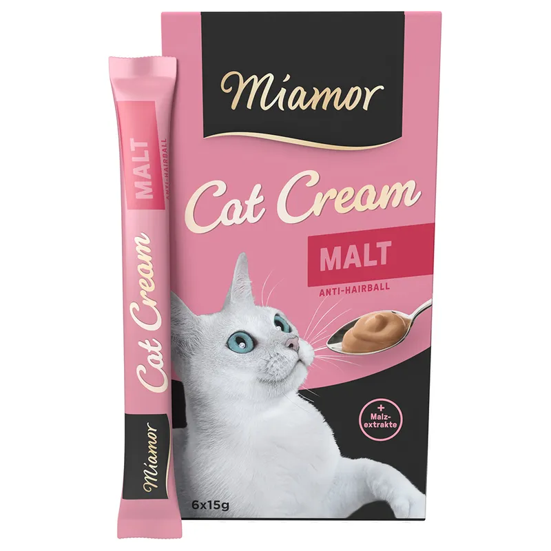 Pasta MIAMOR Malt Cream została opracowana, aby wspierać naturalne usuwanie połkniętej sierści u kotów. Ekstrakty słodowe i błonnik sprzyjają trawieniu, ograniczając tworzenie się kłębków sierści w przewodzie pokarmowym – szczególnie u kotów długowłosych i intensywnie pielęgnujących futro.