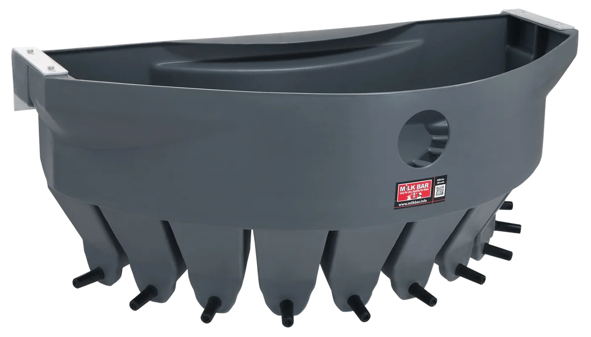 Milk Bar 10 Compartment to zaawansowane karmidło dla cieląt z 10 przegrodami i smoczkami o kontrolowanym przepływie. Każde cielę ma swoje stanowisko, co ogranicza stres, krzyżowe ssanie i problemy trawienne. Idealne rozwiązanie dla hodowców, którzy chcą mieć pełną kontrolę nad karmieniem grupowym.