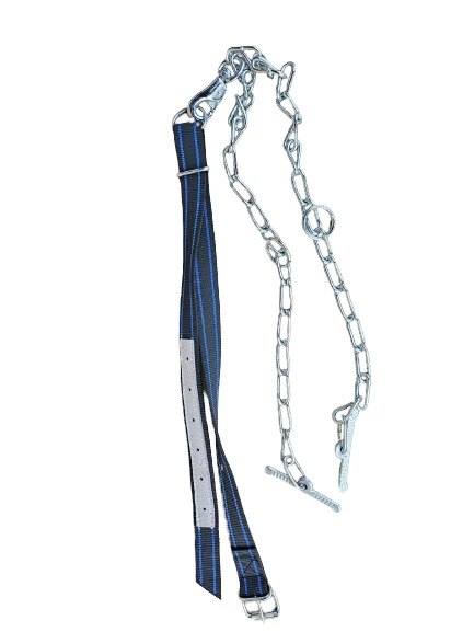 Profesjonalne wiązanie CLASSIC GRAY/BLUE dla krów 130/4 cm z dwoma ocynkowanymi łańcuchami, karabińczykiem, przetoczką i krętlikiem. Wzmocniona skórzana obroża w biało-zielone pasy.