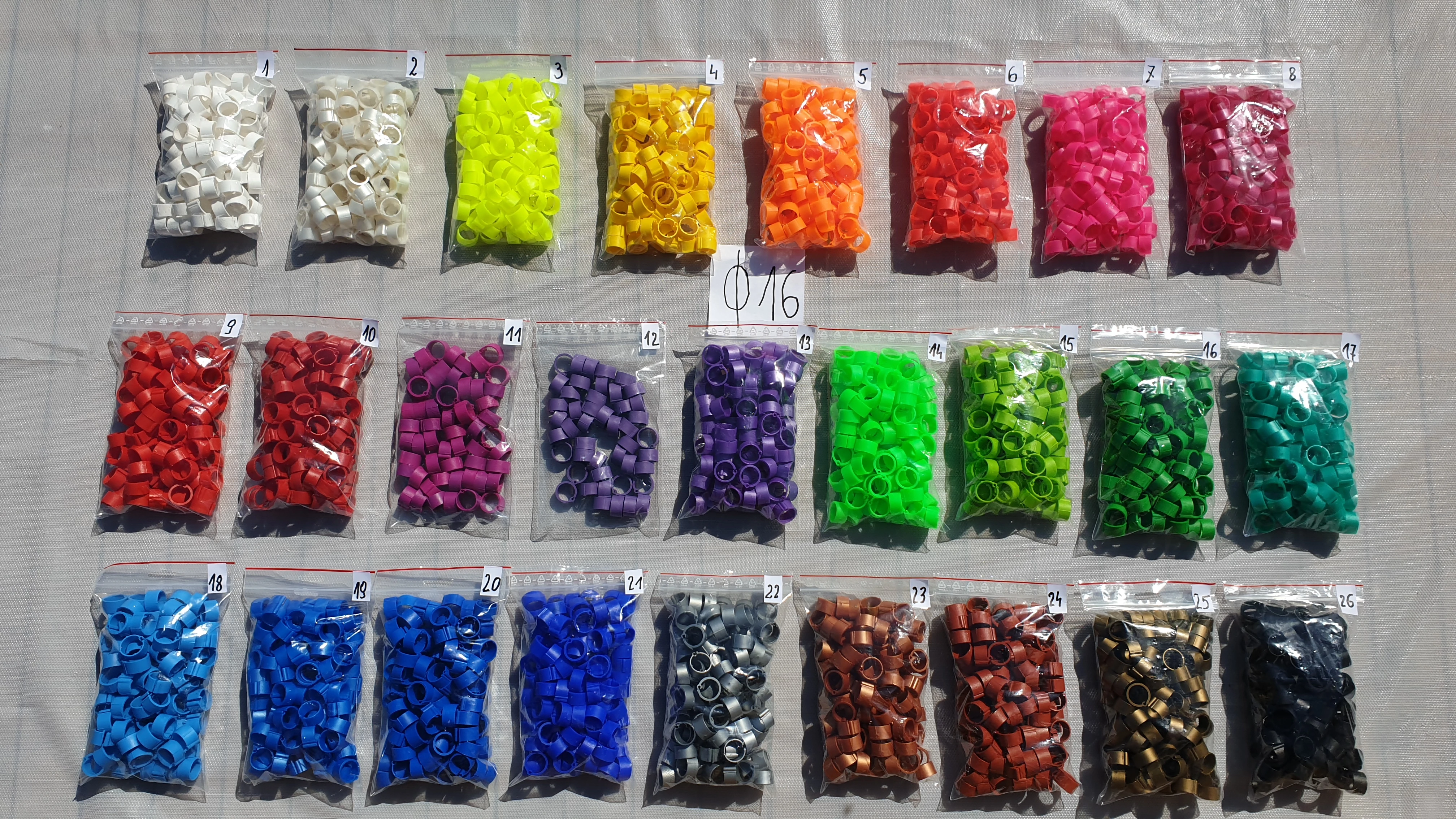 Obrączki 16 mm (100 szt.) do znakowania dużych ras kur i kaczek. Zatrzask, szer. 12 mm, trwałe kolory. SKU 40.Obr.16, EAN 5908450511587.