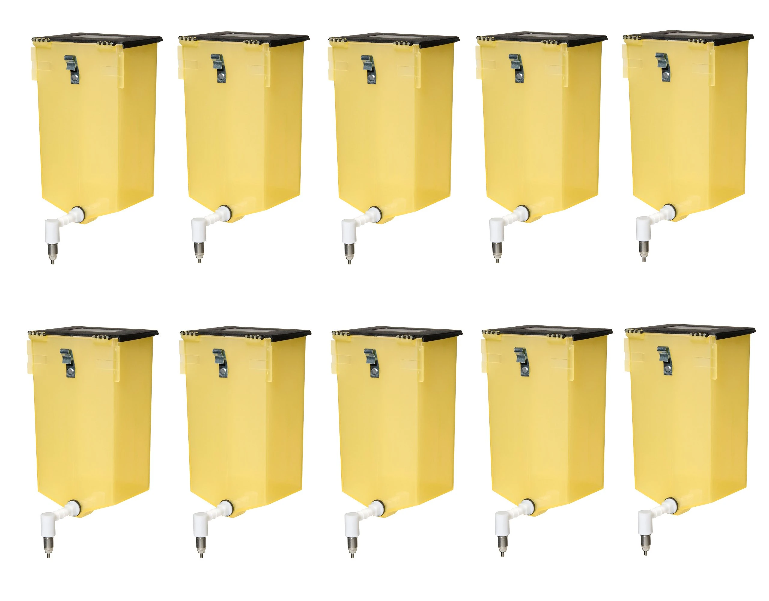 Komplet 10 poideł 1L żółto/czarnych dla królików, gryzoni i drobiu. Smoczek ze stali nierdzewnej, higieniczne napełnianie od góry, trwałe tworzywo.