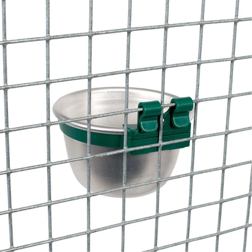 Aluminiowa miska (100 mm) do wody i karmy dla drobiu, gryzoni i ptaków ozdobnych. Montaż śrubami lub zawieszenie na siatce, plastik UV, łatwa konserwacja