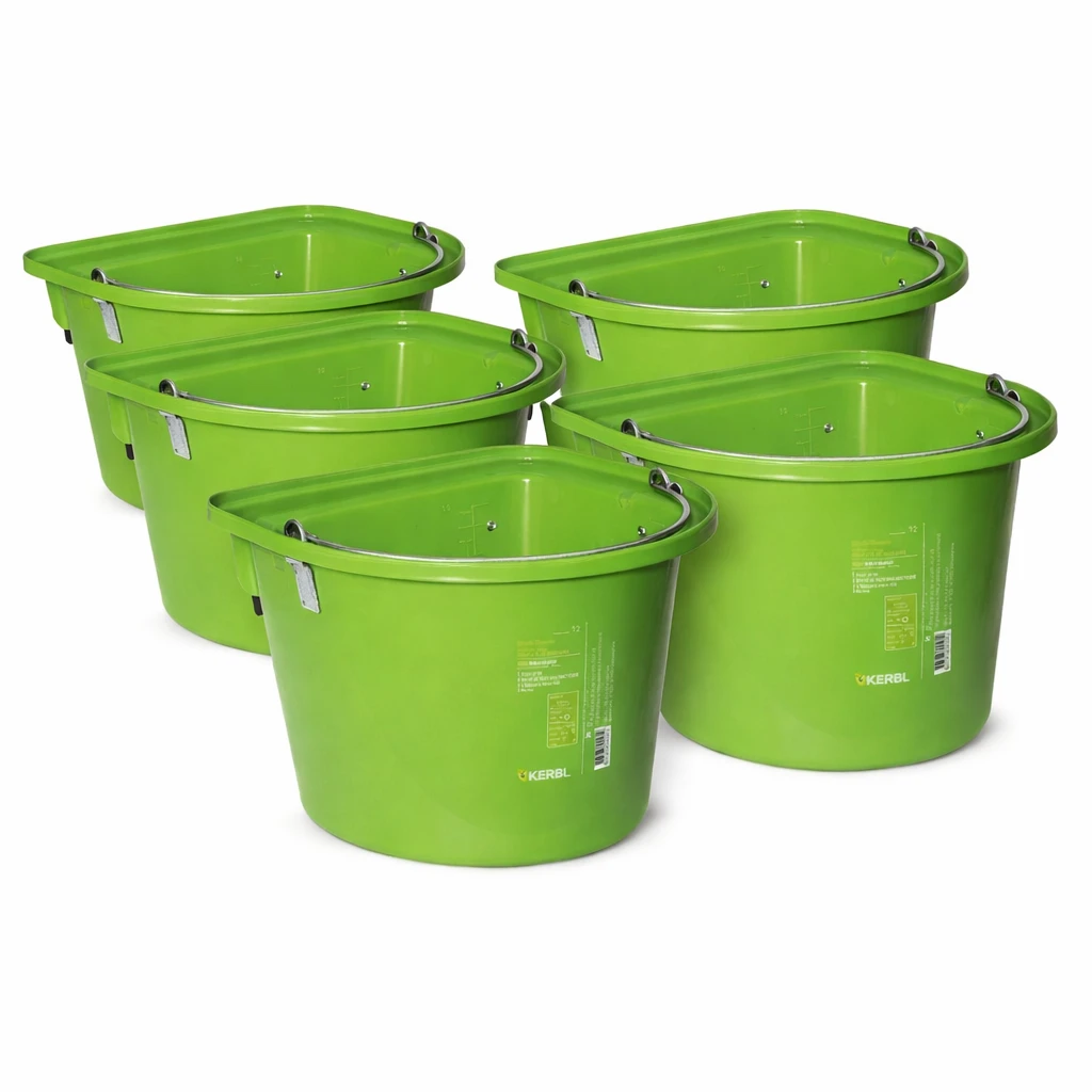 Karmidło 12 l dla bydła i koni – jasnozielone, zestaw 5 szt. Zawiesie, pałąk, podziałka 1 l, tworzywo FOOD SAFE. SKU 10-1159-5szt, EAN 5908450511495.